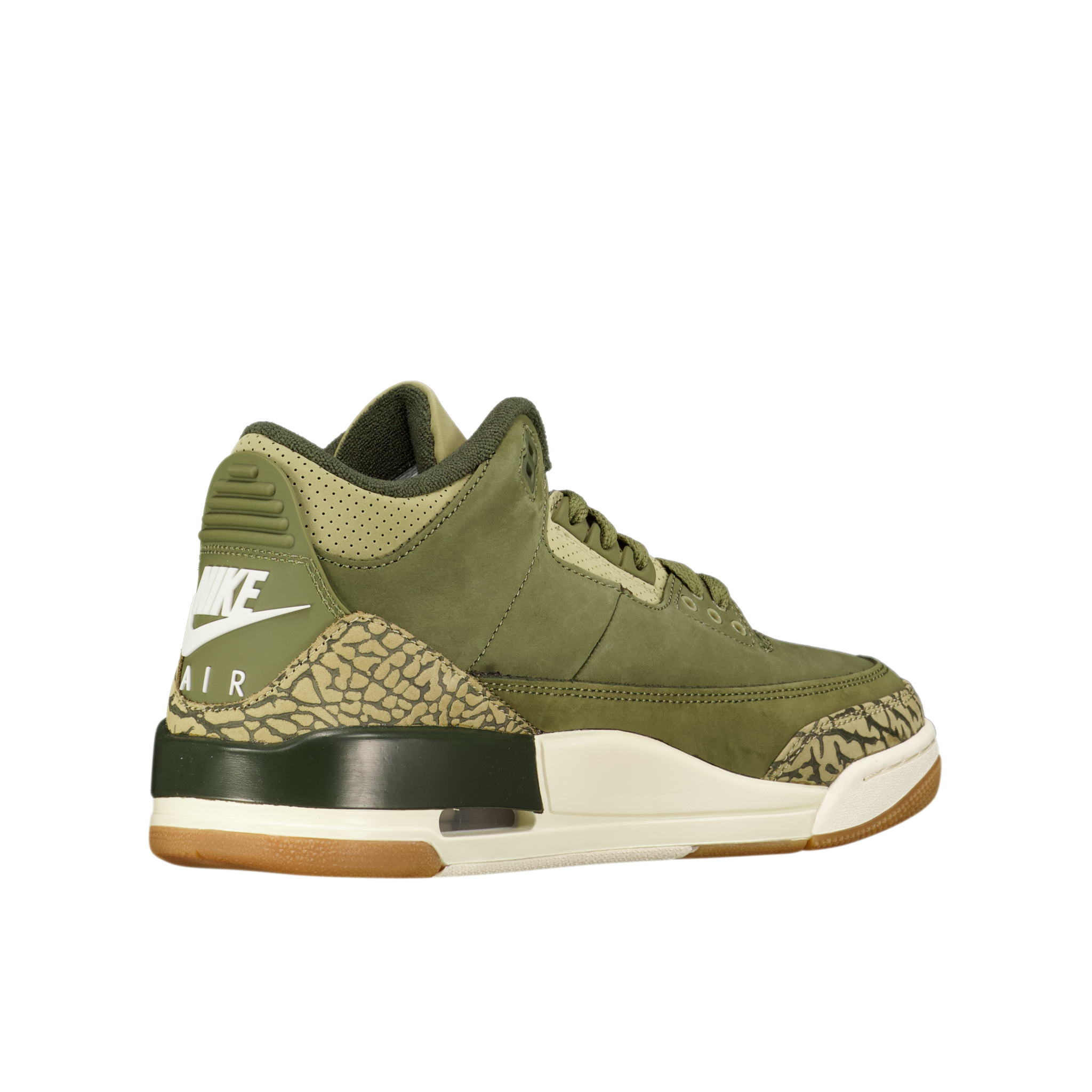 The Air Jordan 3 Retro 'Family Affair' (GS) blends premium nubuck with an earthy palette of medium olive, sequoia, neutral olive, sail, and total crimson for a refined fall aesthetic. Signature elephant print accents in lighter green wrap the toe and heel, enhancing its textured look. A gum rubber outsole anchors the design while classic Nike Air branding on the heel delivers authentic heritage appeal. Designed for collectors and newcomers alike, this release offers a sophisticated update to a legendary silhouette ideal for the autumn season.
