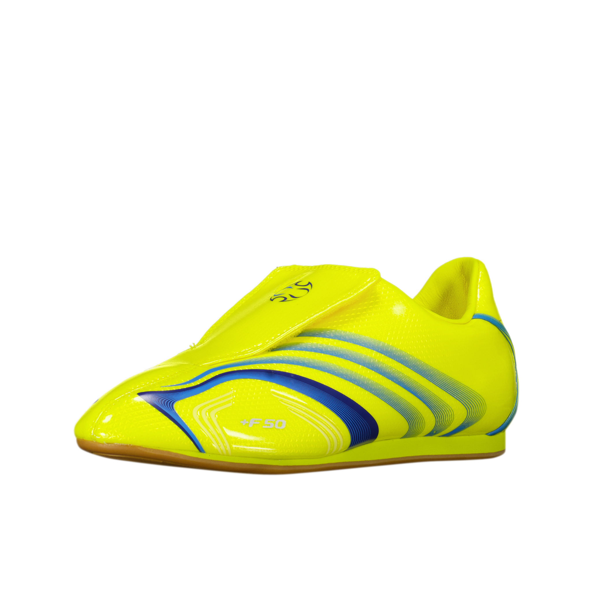 The Adidas F50 Taekwondo shoes in Bright Yellow deliver professional-grade performance for serious practitioners. Engineered specifically for taekwondo's technical demands, these shoes provide the optimal balance of flexibility and support required for precise movements. The vibrant yellow colorway with blue accents enhances visibility during competitions while reflecting the dynamic energy of the sport. Superior grip technology ensures stability during pivots and kicks, while the lightweight construction minimizes fatigue during extended training sessions. These shoes represent the pinnacle of taekwondo footwear design, merging technical excellence with bold aesthetics.