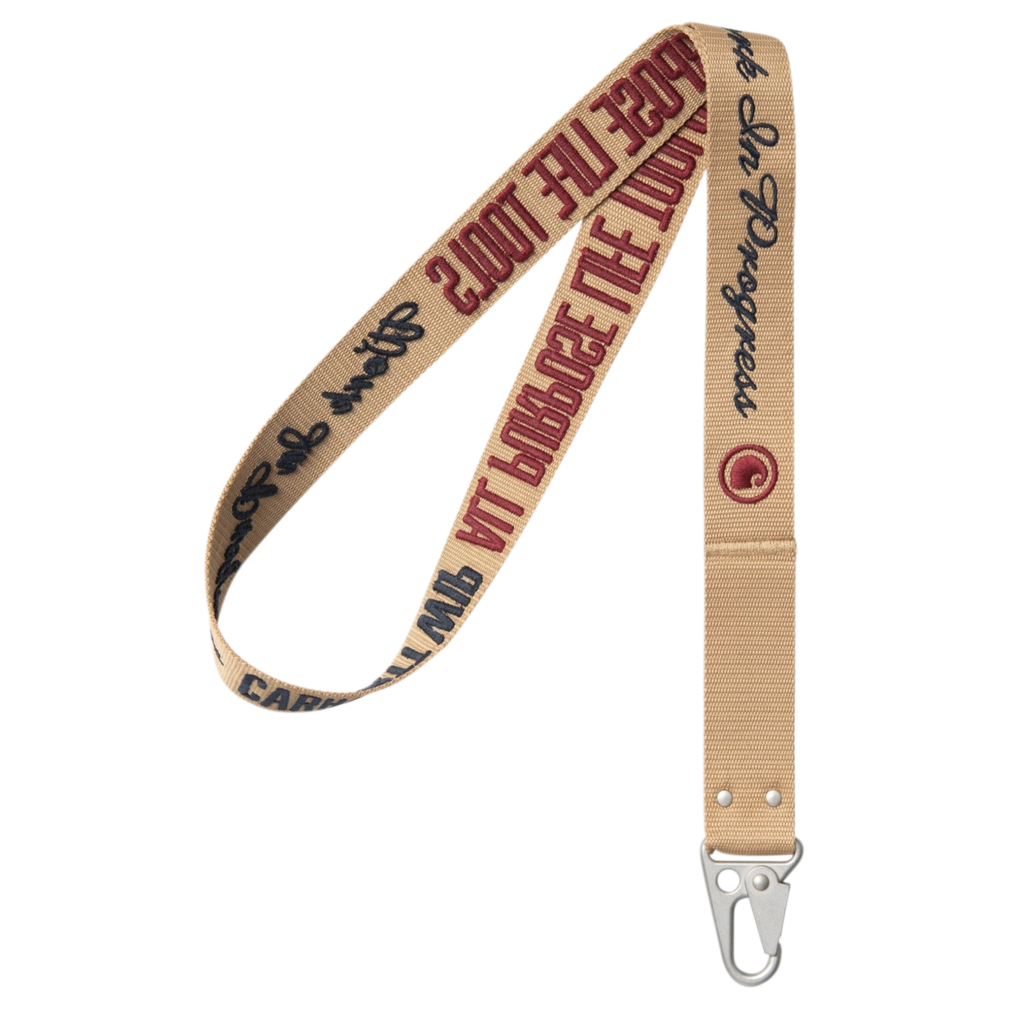 The Arcan Keychain has a strap made from recycled polyester webbing that is attached to a nickel-free metal hook. The item is detailed with graphic embroidery.