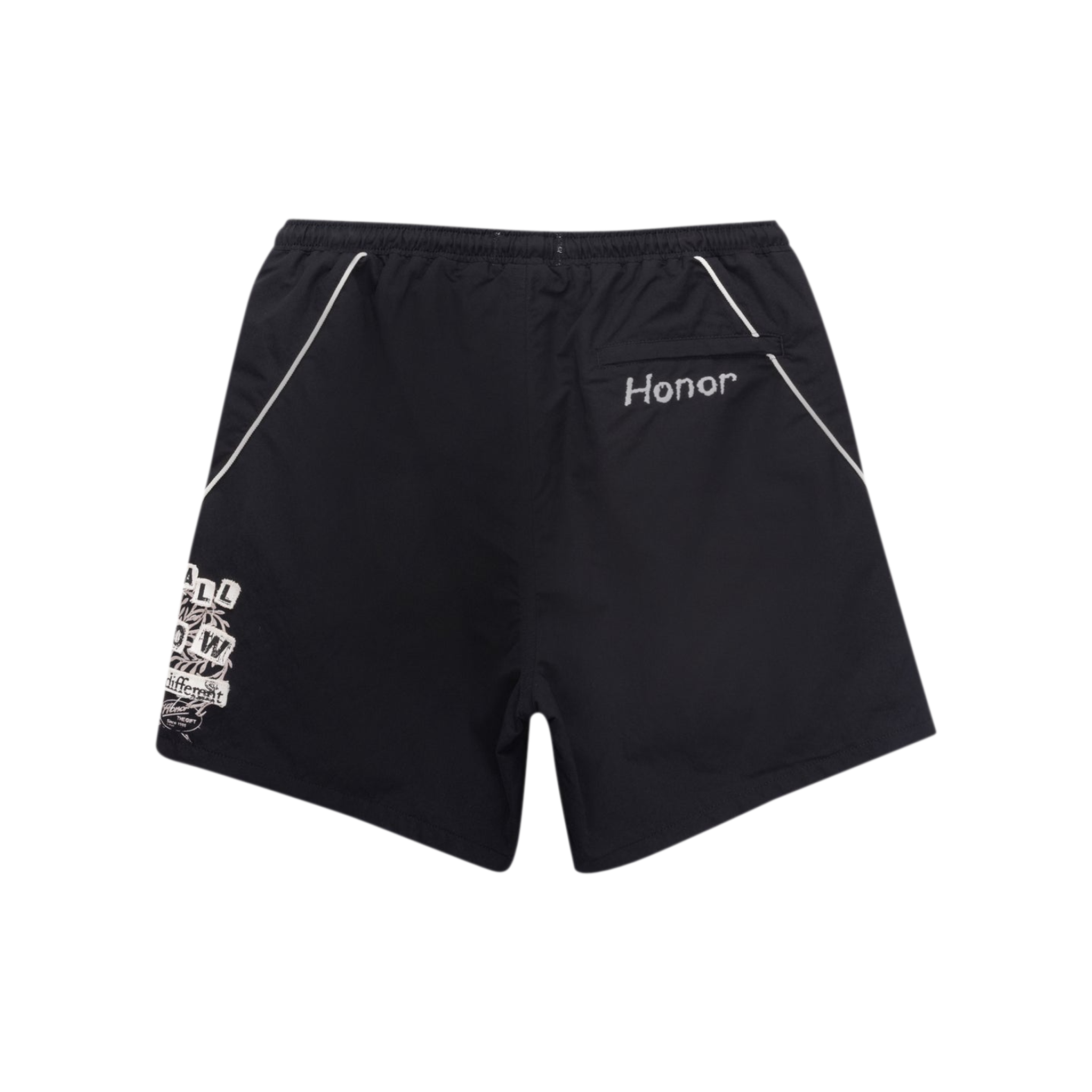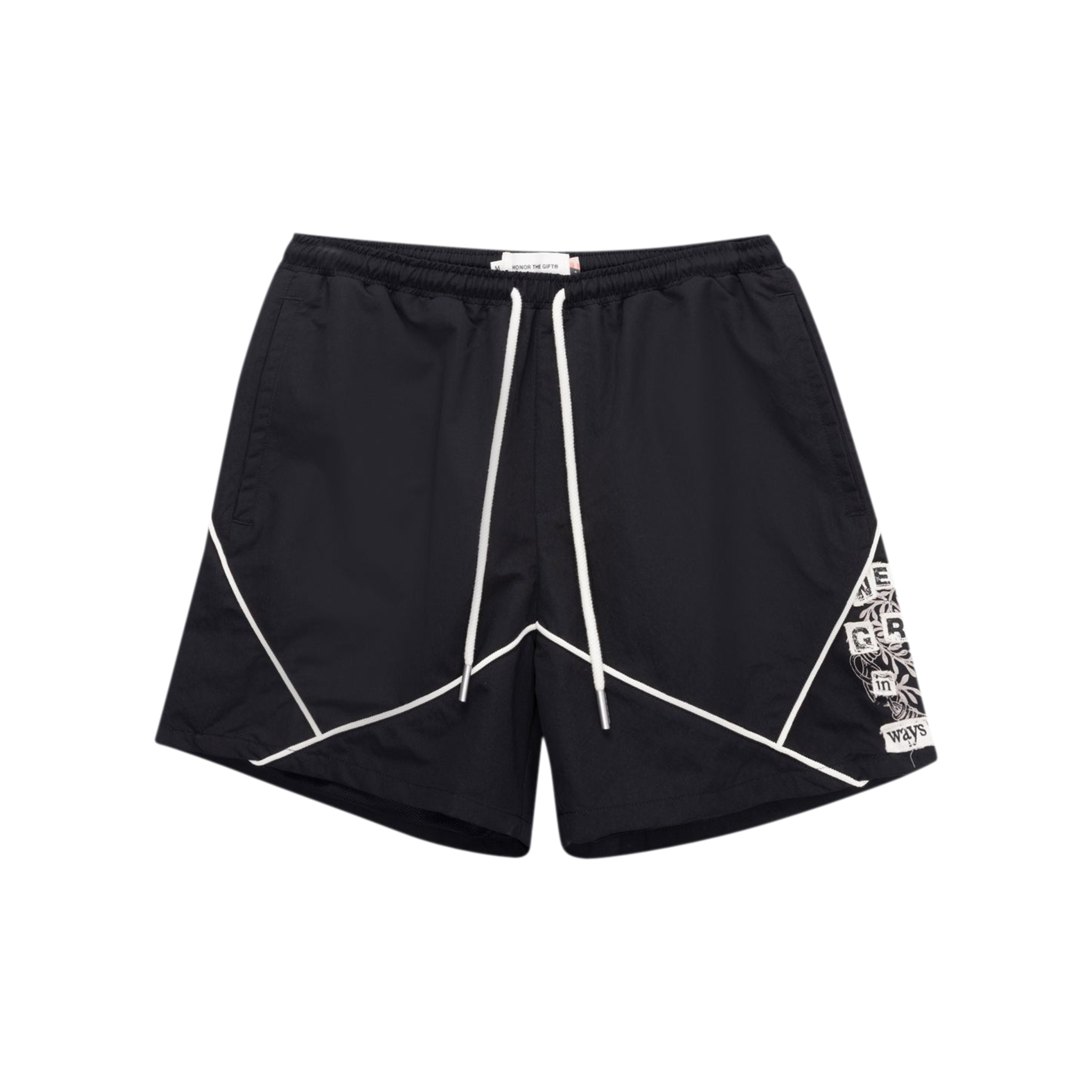 The Track Short is made from a lightweight, durable blend of 90% nylon and 10% polyurethane—ideal for both active days and casual wear. Featuring a taupe color with bold dark blue geometric piping, these shorts combine sporty style with streetwear appeal. The elastic waistband and adjustable drawstring ensure comfort, while a distinctive graphic print on the leg adds an artistic touch.