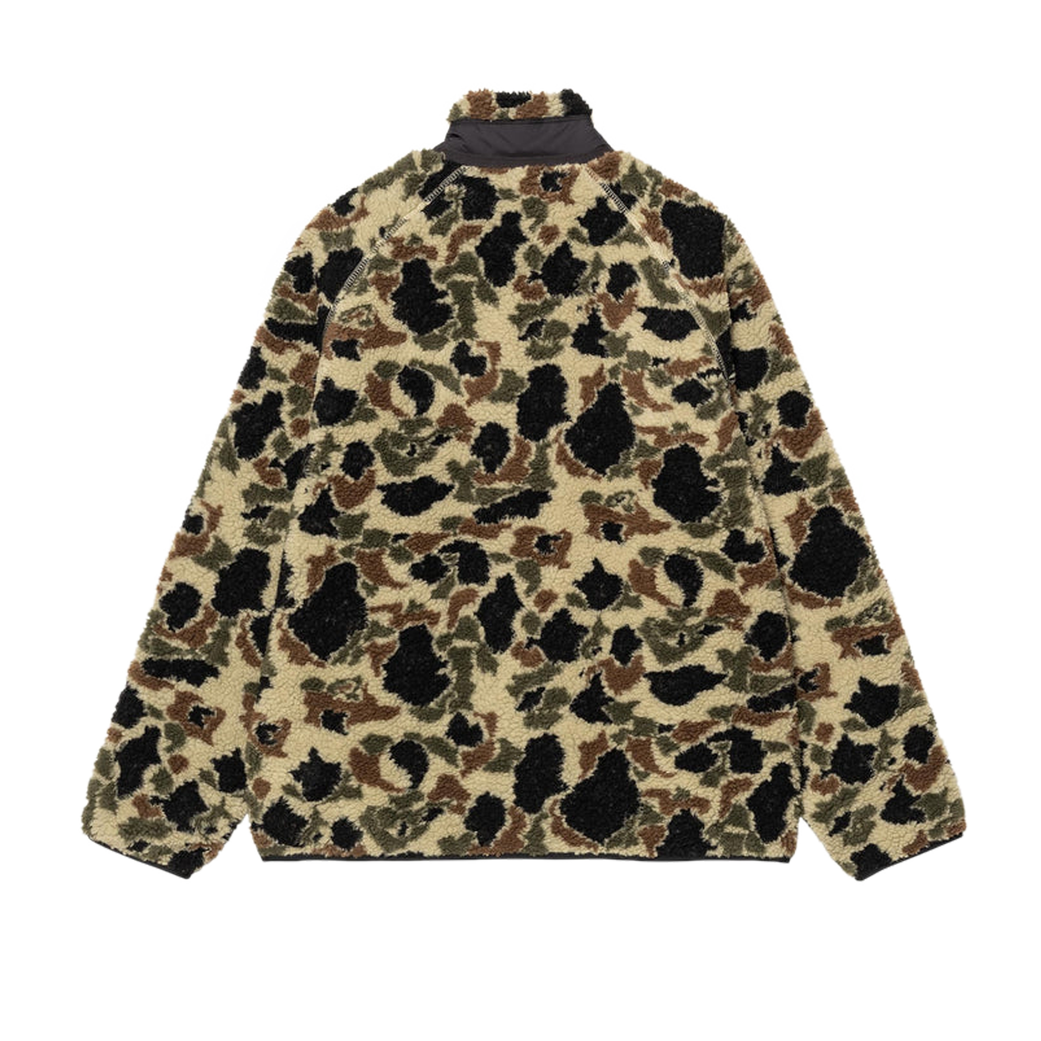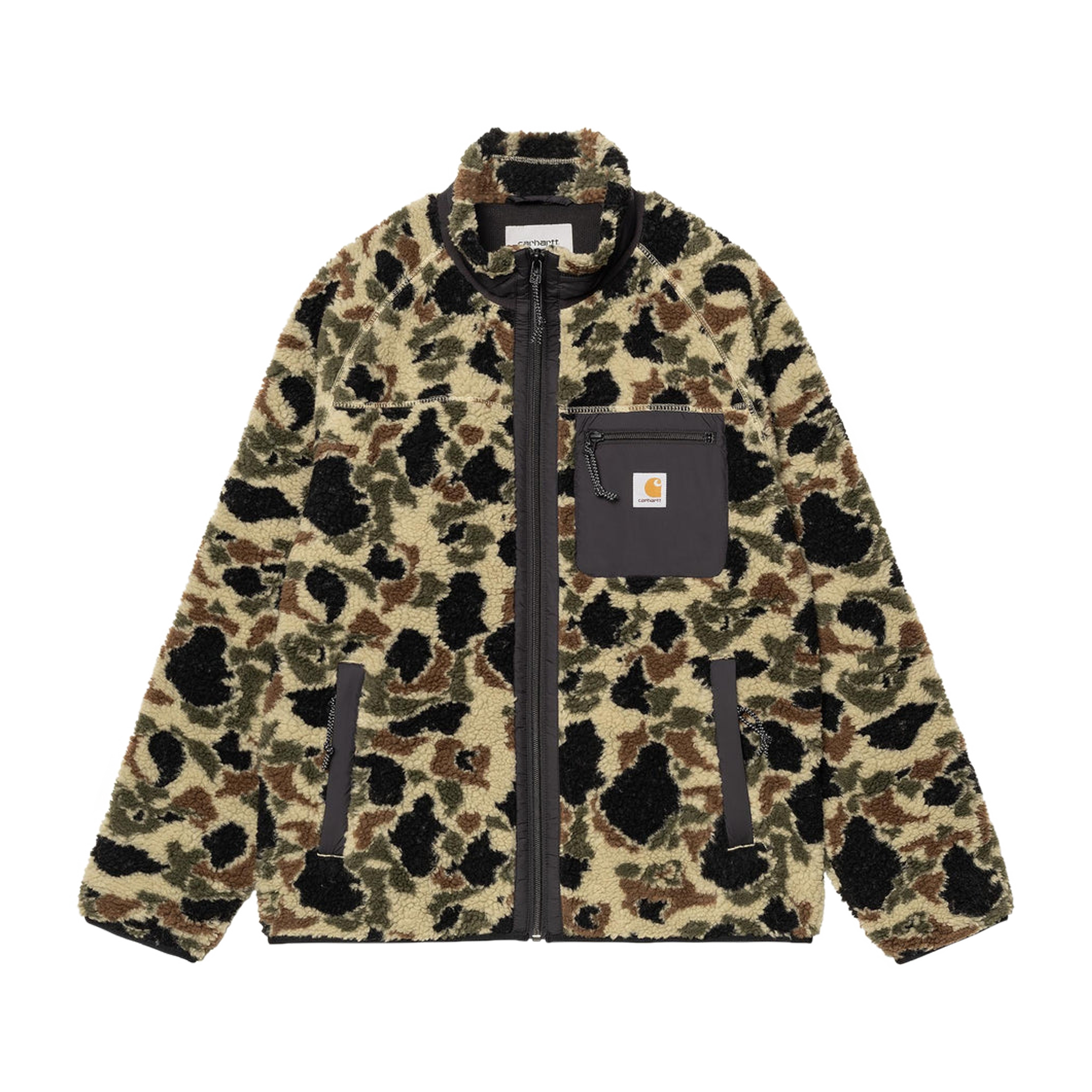 The Prentis Liner is a midweight style constructed from polyester pile. While some iterations of the Prentis Liner feature an allover block color, others have a jacquard outer shell depicting a camouflage design, or the baroque-inspired Verse motif. Inside, the garment is lined with mesh at the body and nylon taffeta at the sleeves. It is detailed with a funnel neck, contrasting nylon taffeta chest pocket and woven Square Label.
