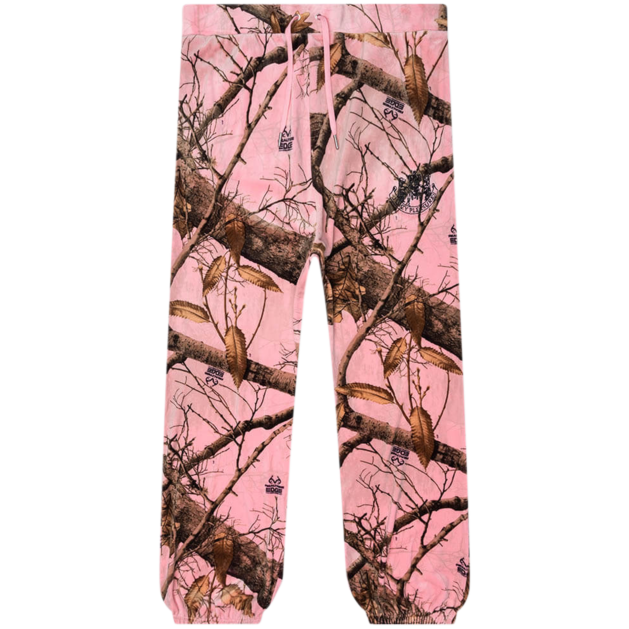 Introducing the Realtree Velour Track Pants from Pleasures x Juicy Couture. Made from a soft velour blend of polyester and elastane, it delivers plush comfort with bold attitude. Featuring an elasticated drawstring waistband, three pocket design, and elastic hems at the hems for a jogger silhouette. Finished with an embroidered dual-branded logo on the left leg.